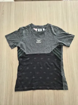 T-shirt Adidas grigia e nera per bambino/a di 10 anni. - Logo Adidas sul petto. - Fantasia con logo Adidas ripetuto sulla parte inferiore. - Dettagli a righe sui lati.