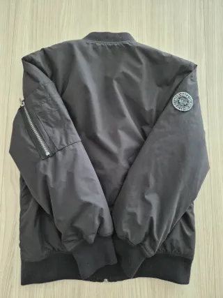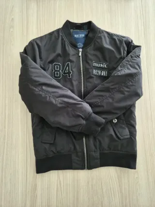Bomber nero per bambino, taglia 10 anni. - Chiusura con zip frontale. - Tasche laterali. - Patch 84 sul petto. - Patch MUSIC ROCK ON! sul petto.