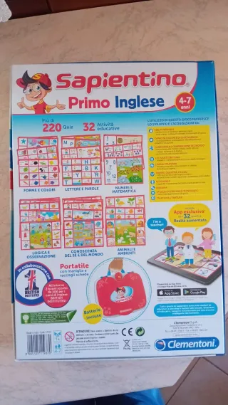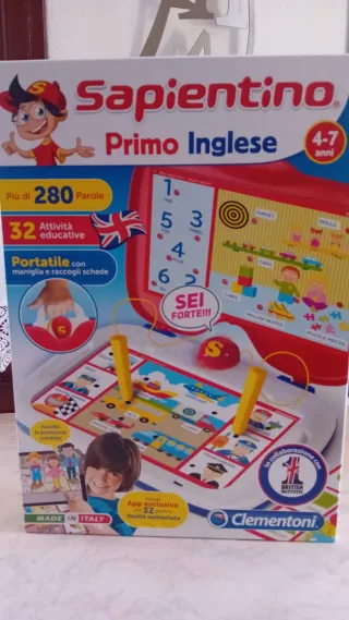 Gioco Sapientino Primo Inglese, ideale per imparare l'inglese. - Contiene più di 280 parole. - Offre 32 attività educative. - È portatile con maniglia e raccogli schede. - Include app esclusiva con realtà aumentata. - Prodotto in Italia.