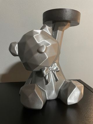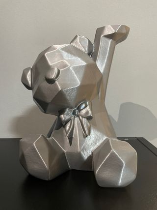 Orsetto decorativo in stile geometrico, con finitura effetto argento. Ideale come bomboniera o elemento d'arredo. Creato con stampa 3D. (Personalizzabili misure, colore) - Design moderno e stilizzato. - Dettaglio fiocco sul collo. - Materiale effetto metallo lucido.