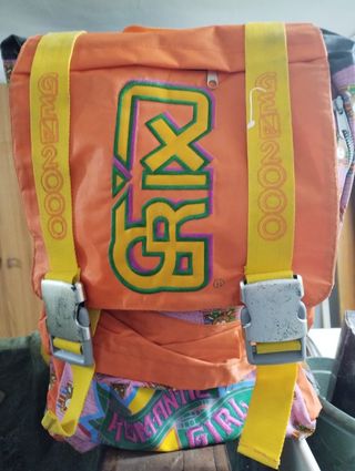 Zaino arancione con tracolle gialle e fibbie metalliche. Include una cartella in plastica. - Zaino con logo GRIX ricamato. - Tracolle con logo GOONZOO ripetuto. - Chiusure a scatto in metallo.