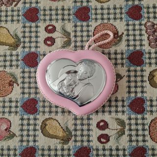 Medaglione capoculla argento raffigurante due angioletti. - Presentazione elegante con pizzo turchese. - Perfetto stato, nuovo. - Incluso scatola originale.