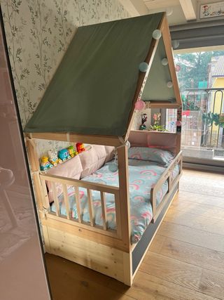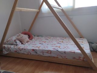 Letto per bambini Montessori tipo Casita 140x70 Questo letto casita, ispirato alla metodologia Montessori, è progettato per promuovere l'autonomia dei bambini fin dai primi anni. Il suo design a livello del pavimento consente ai bambini di accedere e uscire dal letto in totale sicurezza e libertà, favorendo la loro indipendenza nel riposo quotidiano. La struttura In vendita insieme al tetto. Tutto in perfette condizioni Includo la barriera che presenta graffi dovuti all'uso.