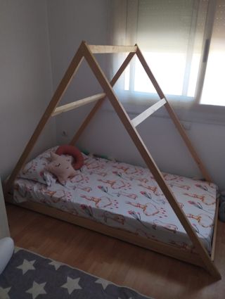 Lettino a forma di capanna, ispirato al metodo Montessori, perfetto per la cameretta dei più piccoli. - Struttura in legno naturale. - Design a capanna aperto.