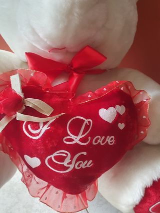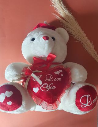 Peluche con h. Di 55cm nuovo bianco con particolari rossi cuscino con scritta #iloveyou più toppe rosse con scritte e decori sui piedi