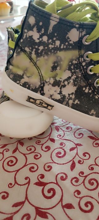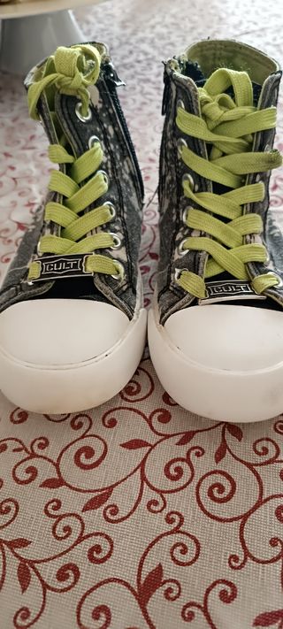 Vendo un paio di sneakers alte Cult per bambino. Sono in buone condizioni, con un design particolare a bollicine n 28. - Modello: sneakers alte - Marca: Cult - Colore: grigio e bianco con dettagli verde lime - Chiusura: con zip e lacci