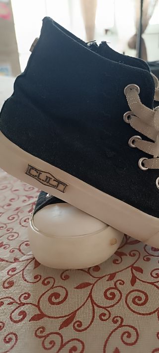 Vendo paio di sneakers alte Cult per bambina, in buone condizioni. Sono nere con dettagli bianchi e lacci bianchi glitter n. 31 - Sono alte alla caviglia. - Hanno una chiusura con zip e lacci. - Il logo Cult è visibile sulla linguetta.