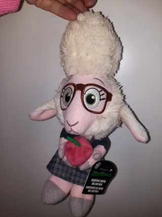 Peluche di un personaggio del film Disney Zootropolis. La bambola indossa occhiali e un vestito a fantasia. - Dettagli ricamati sul viso. - Tiene in mano una mela rossa. - Materiale morbido e soffice.