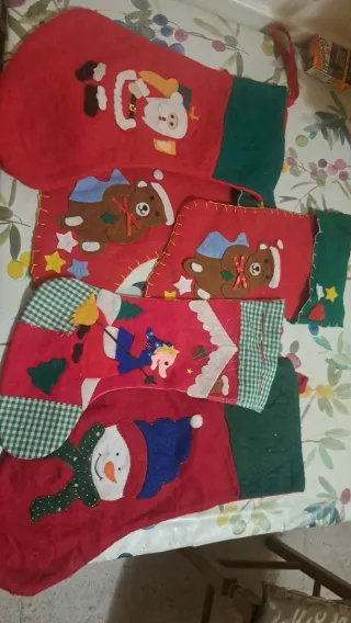 Set di quattro calze natalizie decorate. - Calza rossa con Babbo Natale - Calza rossa con orsetto e stelle - Calza rossa con bambina e scopa - Calza rossa con pupazzo di neve