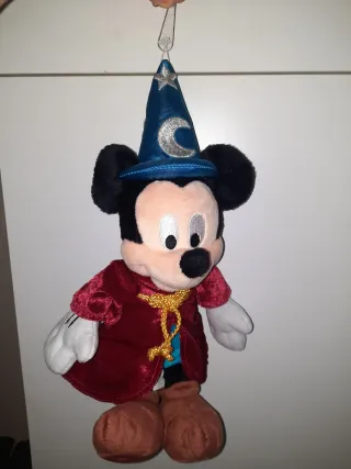 Peluche di Topolino vestito da mago, proveniente dal Disney Store. Indossa un cappello blu scintillante con una stella e una luna argentate, e una veste rossa con dettagli dorati. - Cappello da mago blu con decorazioni argentate. - Veste rossa con finiture dorate. - Prodotto originale Disney Store.