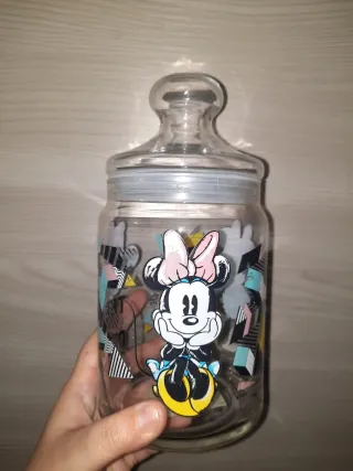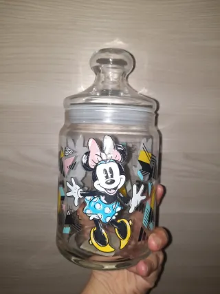 Biscottiera in vetro con decoro di Minnie Disney. Perfetta per conservare biscotti o caramelle. - Design con Minnie e motivi geometrici. - Coperchio in vetro con guarnizione.
