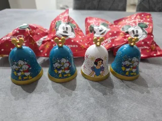 Set di 4 campanelle Disney a tema natalizio. - Personaggi Disney inclusi: Paperino, Paperina, Qui, Quo, Qua e Biancaneve. - Decorazioni natalizie con Mickey Mouse sulle confezioni.