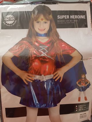 Costume da supereroina per bambina, taglia 7-9 anni. Perfetto per feste in maschera o per giocare. - Include: fascia per capelli, mantello, cintura e vestito. - Colore: rosso e blu con dettagli argentati. - Marca: Fiestas Guirca.