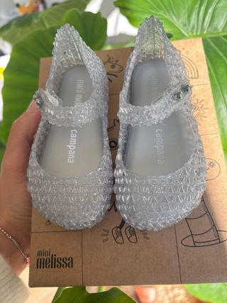 Bellissime ballerine Mini Melissa per bambina, numero 21. - Modello trasparente con glitter. - Chiusura con cinturino e bottone. - Decorazione a forma di fiocco sul cinturino.