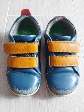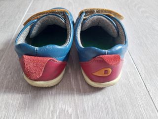 Vendo scarpe Bobux per bambino, in pelle blu, arancio e rosso. Sono usate, in buone condizioni generali, con qualche segno di usura come da foto.
