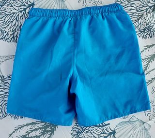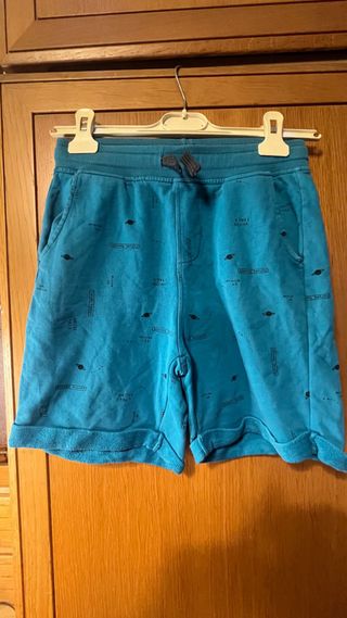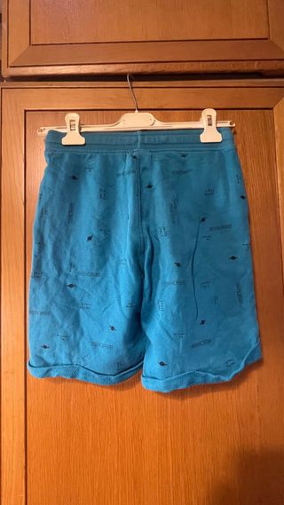 Pantaloncini comodi per bambino, taglia 8/9 anni. - Colore blu petrolio. - Fantasia con pianeti e scritte. - Vita elasticizzata con laccetti. - Orlo risvoltato.