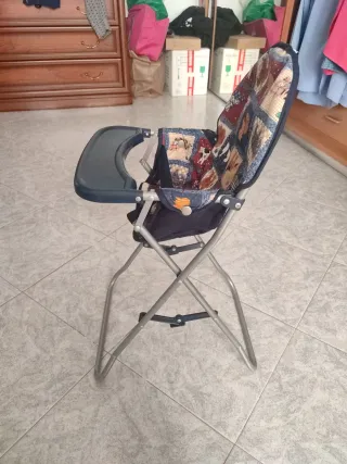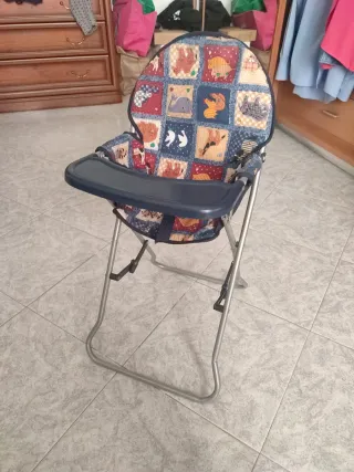 Seggiolino da tavolo per bambole con fantasia colorata. - Seduta imbottita con fantasia di animali. - Vassoio blu - Struttura pieghevole in metallo. In ottime condizioni, ha solo il cinturino scucito, seggiolino in stoffa rimovibile comodo per pulirlo separatamente