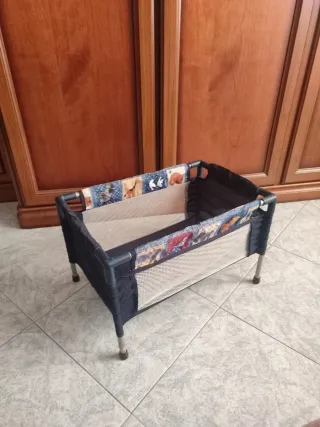 Culla per bambole con struttura in metallo e tessuto. - Tessuto con fantasia di animali. - Rete laterale. - retina un po' sporca - facile sia da montare che smontare DA LAVARE