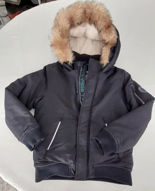 Caldo giubbotto Okaidi con cappuccio bordato di pelliccia sintetica. - Chiusura con zip. - Fodera interna in pile. - Dettagli a contrasto sulle tasche.