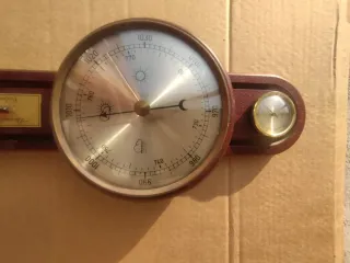 Strumento da parete per misurare temperatura e pressione atmosferica. - Struttura in legno scuro. - Quadrante del barometro con indicazioni in hPa. - Termometro con scala in Celsius.