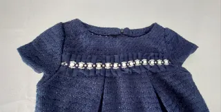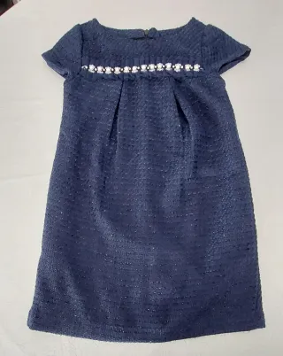 Elegante vestito blu per bambina, perfetto per occasioni speciali. Realizzato in tessuto testurizzato con dettagli luminosi. - Scollo rotondo. - Maniche corte. - Decorazione di perle - Chiusura posteriore con zip.