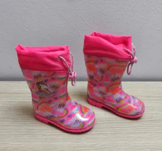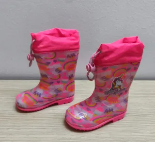 Usati pochissimo, ottima impermeabilità. - Fantasia con unicorni, arcobaleni e cuori. - Colore principale rosa. - Coulisse superiore per regolare la chiusura.