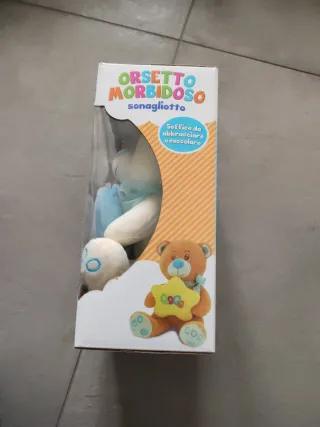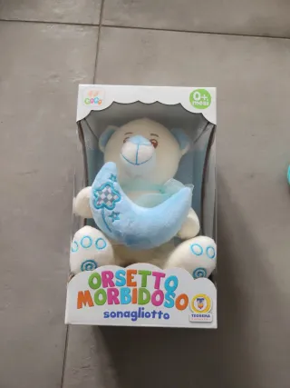 Morbido orsetto con sonaglio, ideale per i più piccoli. - Orsetto di peluche bianco e azzurro. - Tiene in mano una luna azzurra con stelle. - Fiocco azzurro al collo. - Dettagli ricamati sulle zampe.