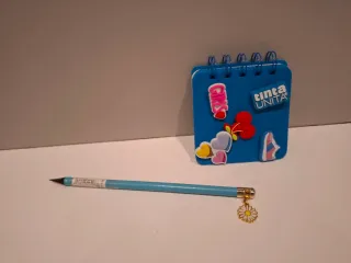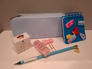 Set di cancelleria in tonalità azzurra, perfetto per organizzare i tuoi appunti e lavori creativi. - Astuccio azzurro in materiale morbido. - Quaderno blu con spirale e decorazioni. - Fermacarte a forma di fiocco. - Matita azzurra con ciondolo a margherita. - Rotolo di washi tape con decorazioni floreali.