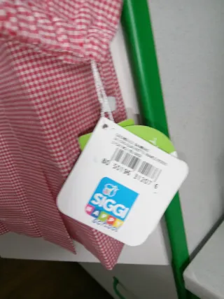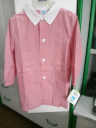 Grembiuli da asilo Siggi, sia per bambina che per bambino, colori e taglie assortite. - Fantasia a quadretti rossi e bianchi. - Colletto bianco. - Chiusura con bottoni. - Tasche applicate sul davanti.