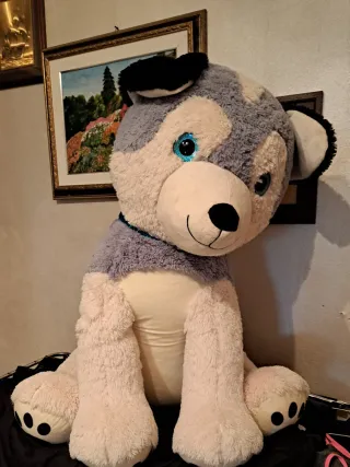 Morbidissimo peluche a forma di cane husky di grandi dimensioni. Perfetto per abbracciare e decorare. - Colore grigio e bianco. - Dettagli con occhi azzurri scintillanti. - Materiale morbido e soffice al tatto.