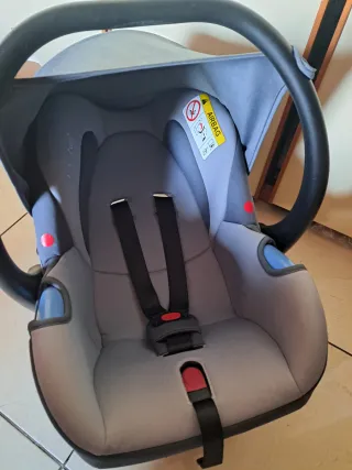 Seggiolino auto per neonato, ideale per i primi viaggi in auto. - Tessuto grigio imbottito. - Cappottina parasole. - Inserto riduttore per neonati.