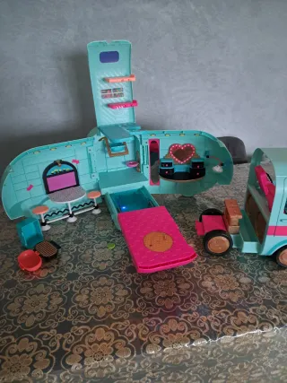 Camper LOL color turchese con dettagli rosa. - Finestrini con tende. - Ruote color oro. - Dettagli a righe rosa lungo la fiancata.