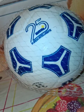 Pallone da calcio Eurospin con design a 25 anni. - Logo Eurospin e Spin sul pallone. - Design con esagoni blu e bianchi. - Scritta DI SPESA INTELLIGENTE. NUOVO MAI USATO