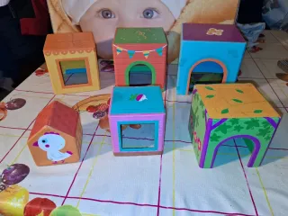 Set di casette giocattolo in cartone, perfette per stimolare la fantasia dei più piccoli. - Casette decorate con colori vivaci e disegni a tema. - Ogni casetta presenta un'apertura per inserire piccoli oggetti o personaggi. - Realizzate in legno resistente e sicuro.