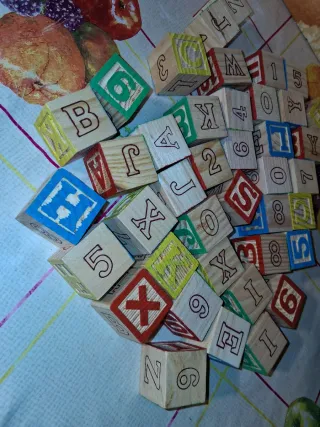 Set di blocchi didattici in legno con lettere e numeri. - Materiale: legno. - Decorazioni con lettere e numeri. - Colori vivaci. -40 PEZZI-