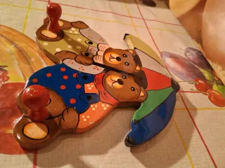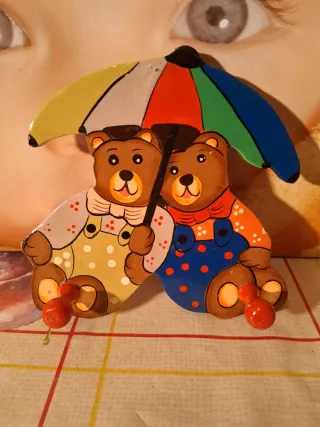Grazioso appendiabiti in legno decorato con due orsetti che condividono un ombrello colorato. Perfetto per la cameretta dei bambini. - Due orsetti in legno dipinto. - Ombrello multicolore. - Dettagli con ciliegine rosse.