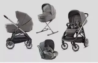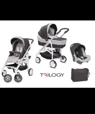 Set di passeggino per neonati della marca Trilogy, ideale per i primi anni. Include ovetto, passeggino, borsa e seggiolino auto. Colore grigio e nero. Regalo: sistema Isofix originale Inglesina e materassino originale Inglesina.