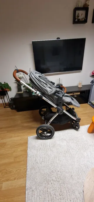 Passeggino Jane Muum in grigio, ideale per passeggiate comode. Caratteristiche: telaio leggero e manovrabile, sedile reversibile, ovetto e passeggino inclusi. Ruote usurate.