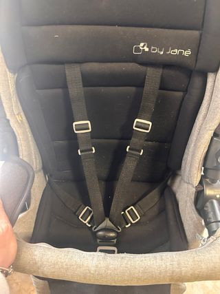 Set di passeggino per neonati della marca Jane, include ovetto e seggiolino auto. - Ovetto con tettuccio. - Seggiolino auto con cintura di sicurezza. - Passeggino con borsa. - Ruote per fuoristrada.