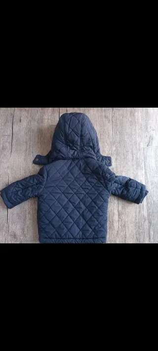Gilet imbottito H&M di colore blu, perfetto per la stagione primaverile. - Taglia 80 cm (9-12 mesi). - Chiusura con zip frontale. - Cappuccio integrato. - Dettaglio logo sul petto.