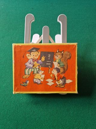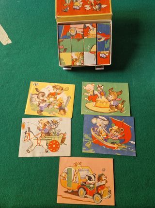 "Puzzle vintage in legno composto da cubi che, se ruotati, permettono di comporre diverse immagini di animali della fattoria o del bosco. Il set include una scatola di legno per contenere i cubi e dei cartoncini di riferimento con le immagini complete.È un classico gioco educativo per bambini, spesso considerato un oggetto da collezione per il suo stile retrò. Le scene raffigurate includono gattini, una cerbiatta, una chioccia con pulcini e un agnellino. "