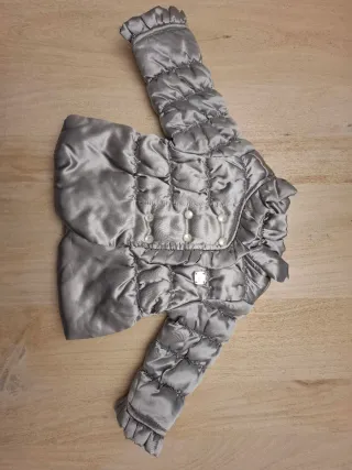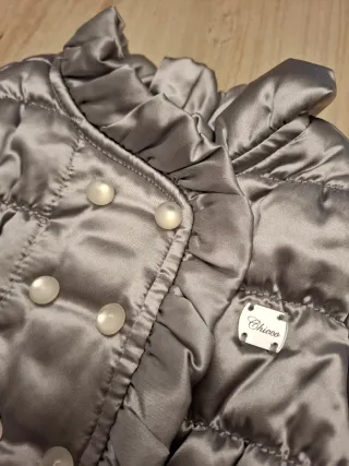 Piumino Chicco per neonato, taglia 6 mesi. Colore grigio. - Tessuto satinato. - Imbottitura trapuntata. - Dettagli con perline. - Volant sulle maniche e sul collo.