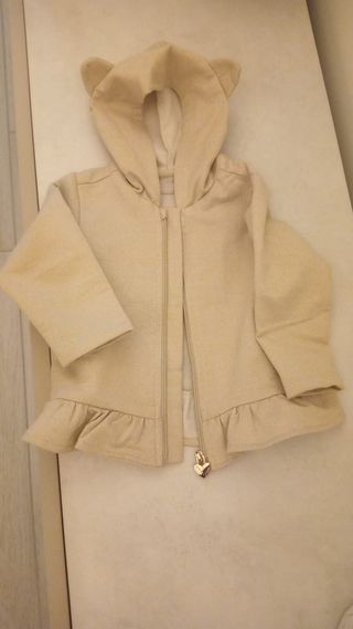 Bellissima felpa Chicco con cappuccio, perfetta per i più piccoli. - Taglia 3/6 mesi. - Colore beige chiaro. - Dettagli con orsetti sulle orecchie del cappuccio. - Fondo con volant. - Chiusura con zip dorata a forma di cuore.