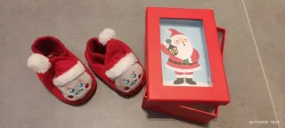 Morbide ciabattine per bambini a tema natalizio. - Design con Babbo Natale. - Colore rosso vivace. - Dettagli con pompon bianchi.