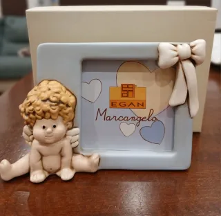 Portafoto per bambino in ceramica azzurra, con angelo e fiocco. - Marca: Egan - Linea: Marcangeli - Colore: Azzurro - Decorazione: Angelo e fiocco