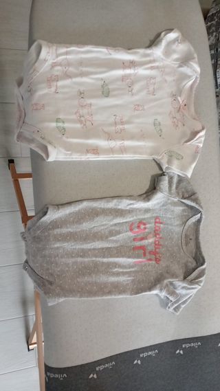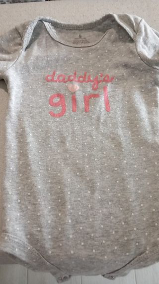 Due body a manica corta per neonata, taglia 9 mesi. - Un body bianco con fantasia di animaletti rosa e verdi. - Un body grigio con pois bianchi e scritta daddy's girl rosa.