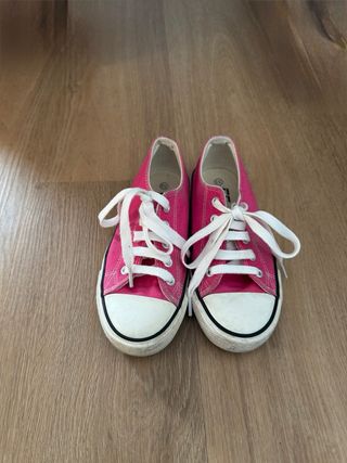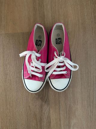 Vendo Sneakers da bambina ES SPORT taglia 33, in tela rosa con punta in gomma bianca e lacci bianchi. Design classico tipo Converse, con bordo nero sul fondo e cuciture a vista. Usate pochissimo, in ottime condizioni: suola pulita, tessuto ntegro, nessun difetto visibile. Perfette per scuola, tempo libero o look casual. Leggere, comode e facili da abbinare. Prezzo trattabile