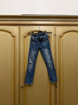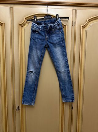 Jeans Benetton per bambino/a, taglia 7-8 anni. Stile vissuto con un tocco moderno. - Denim blu. - Effetto used. - Strappo sulle ginocchia.