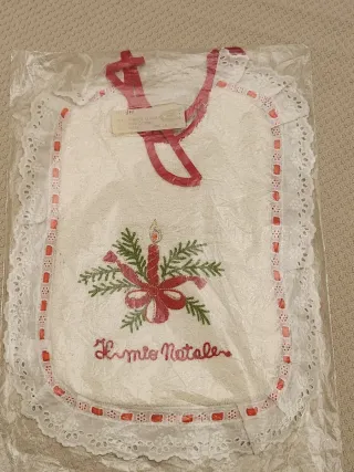 Bavaglino bianco con bordi in pizzo e nastro rosso, perfetto per il periodo natalizio. Presenta un ricamo a tema con candela, agrifoglio e fiocco, accompagnato dalla scritta Il mio Natale. - Ricamo natalizio con candela e agrifoglio - Scritta Il mio Natale - Bordi in pizzo bianco - Dettagli in nastro rosso