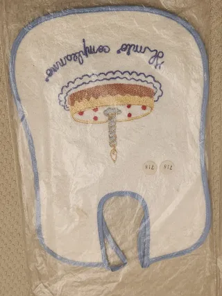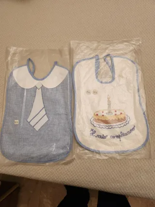 Set di due bavaglini per neonato, confezionati singolarmente. - Bavaglino a quadretti blu con colletto bianco e cravatta. - Bavaglino bianco ricamato con torta di compleanno e scritta Il mio compleanno.